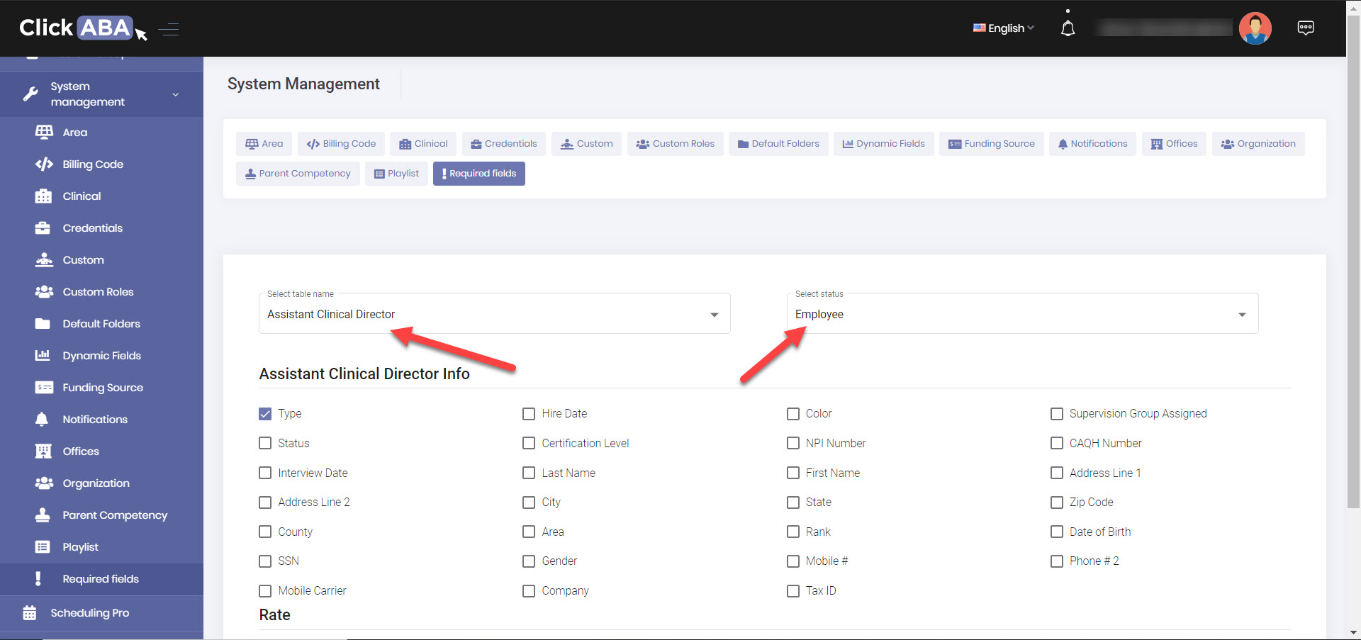 1. Navigate to"System Management" on the menu located on the left hand side of the screen and select "Required Fields" from the drop menu.
