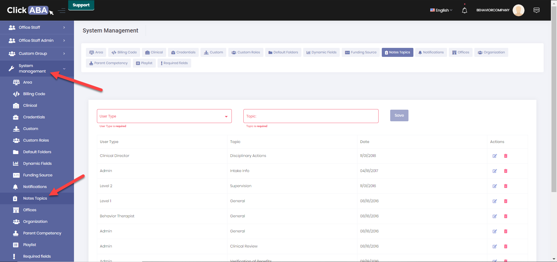1. Select "System Management" from the left hand menu and then select "Notes Topics".