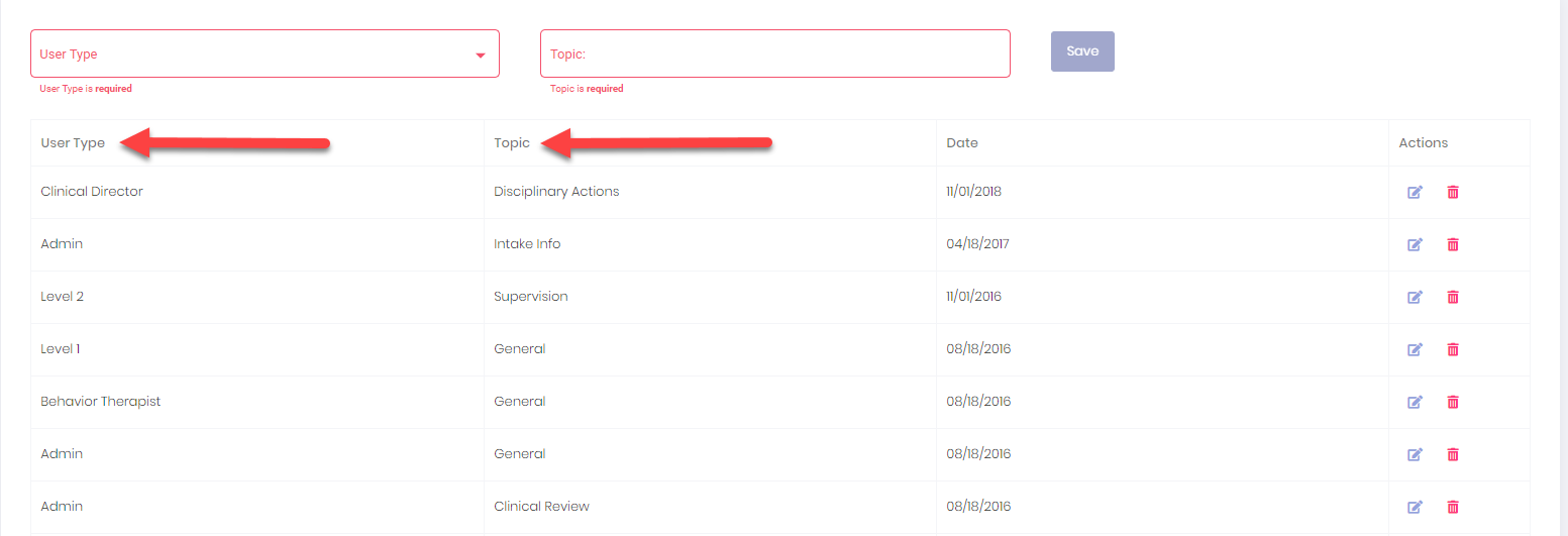 3. To add a note topic first choose a user type, then type the note topic and click "save". You can add as many note topics as needed.