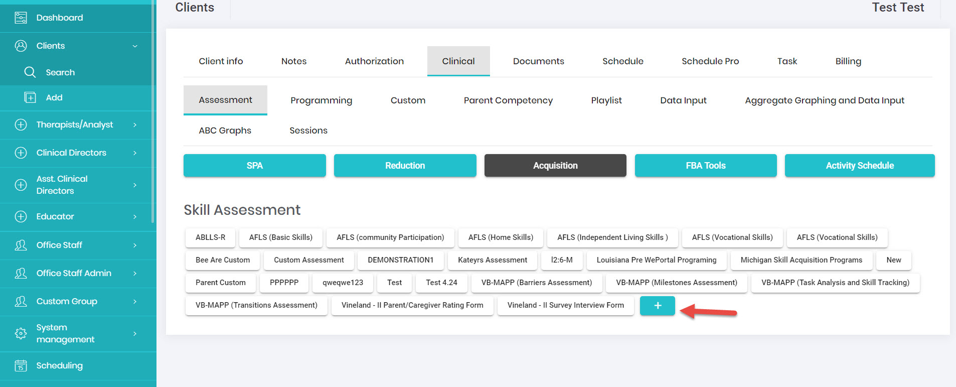 1. In a client's Clinical and Assessment Section, click the plus button for Assessments
